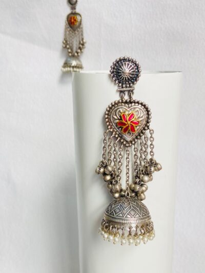 Featuring intricate engravings, delicate chain embellishments, and a vibrant red floral motif, this piece is a perfect blend of heritage and style. Adorned with tiny ghungroo beads and pearl accents, it’s a must-have for every jewelry lover. 💖 Product Details:- Oxidized silver finish Handcrafted floral heart motif Dangling chains with…