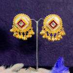 These Enamel & Pearl Jhumka Earrings feature a circular gold-plated design with intricate white enamel work, a central red stone accent, and delicate simulated pearl drops. A classic and elegant style, perfect for adding a touch of traditional glamour to any outfit. Lightweight and comfortable for all-day wear.